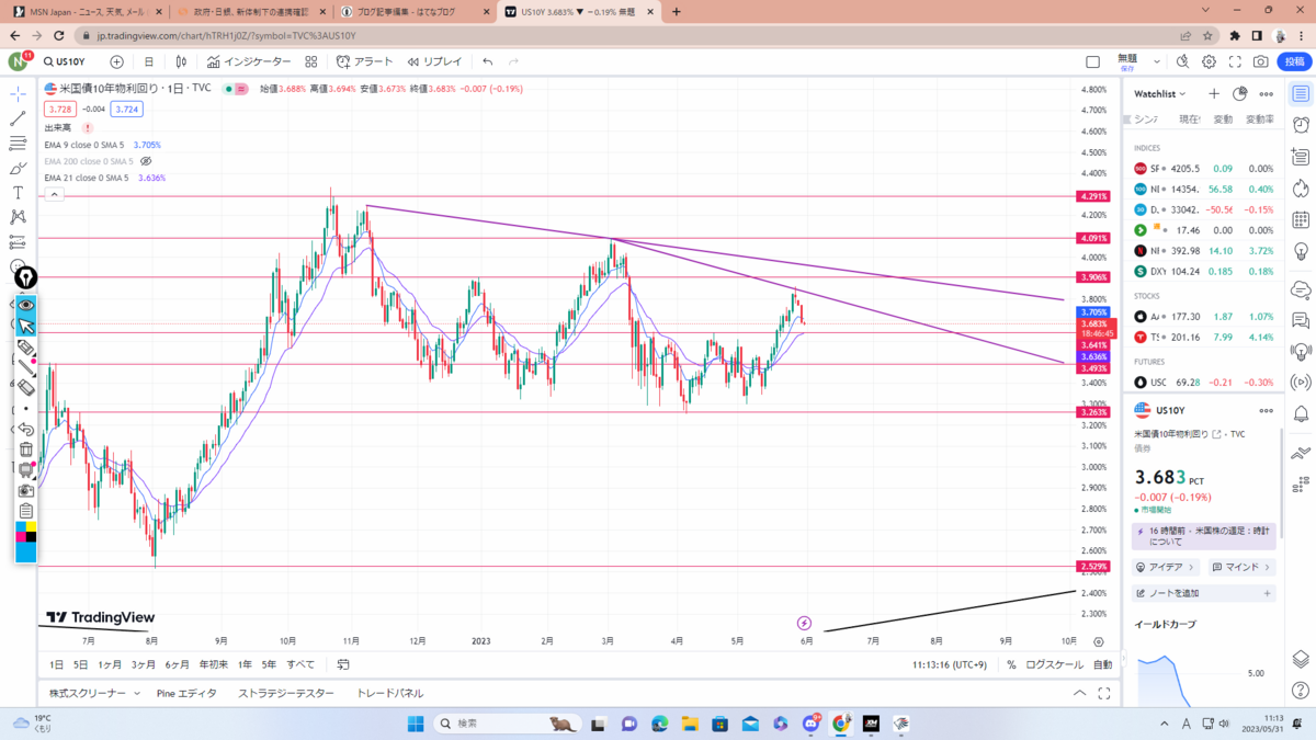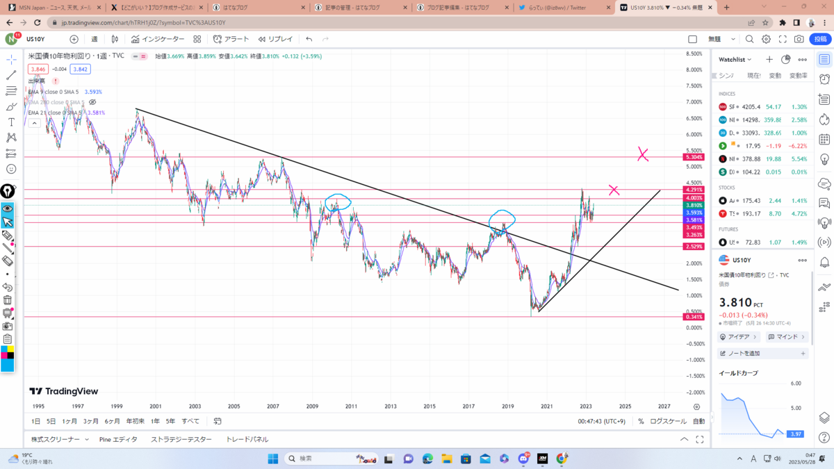 5月26日終値で3.81と調整下落中ですが5.30を目指しそうな勢い。上昇すればもちろんドル買い材料なのでこちらも要チェックです。