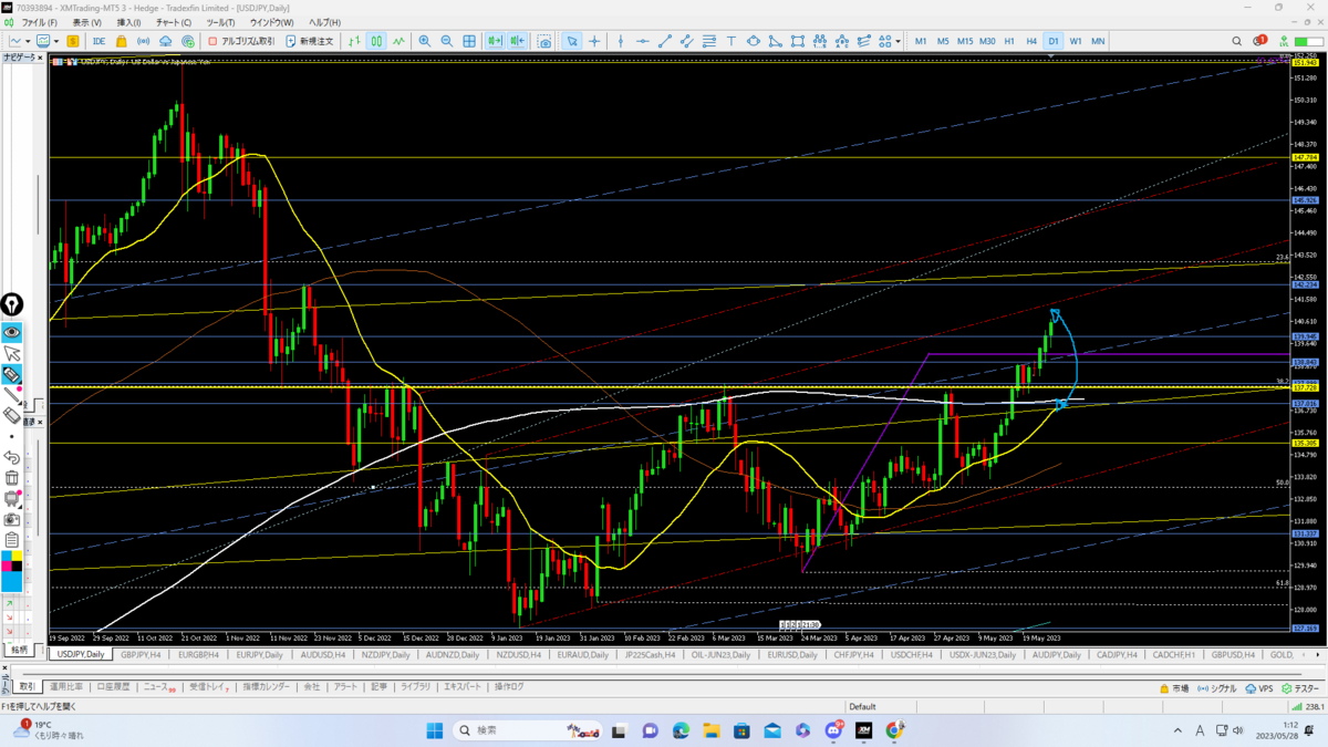5月29日以降の戦略は5月26日の終値140.600から週明け東京時間で下落するなら押し目で買いたいところですが、アメリカの債務上限問題や要人発言などもあるのでなかなか難しいところです。月曜はニューヨークも休場なので火曜日からかな。