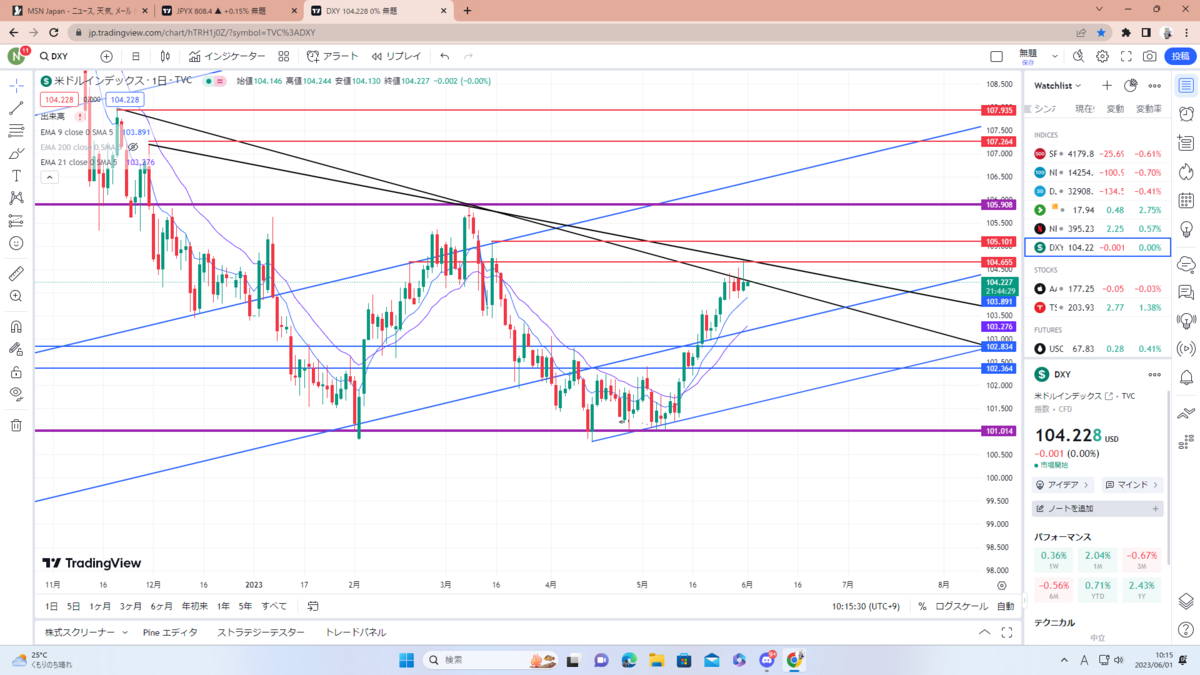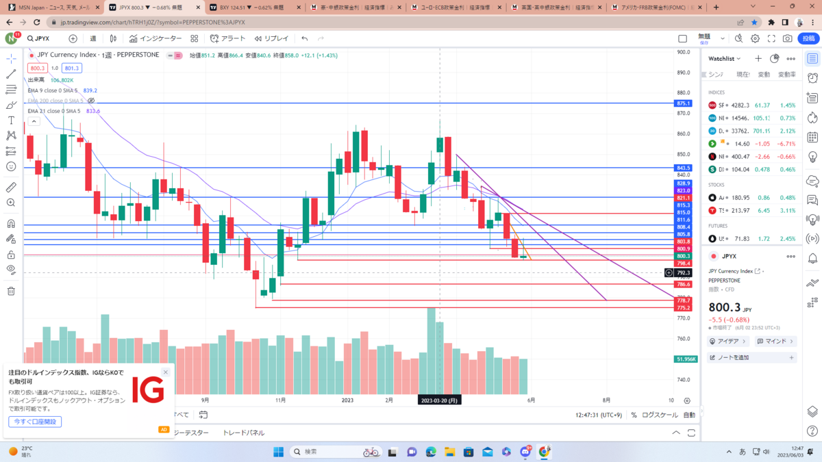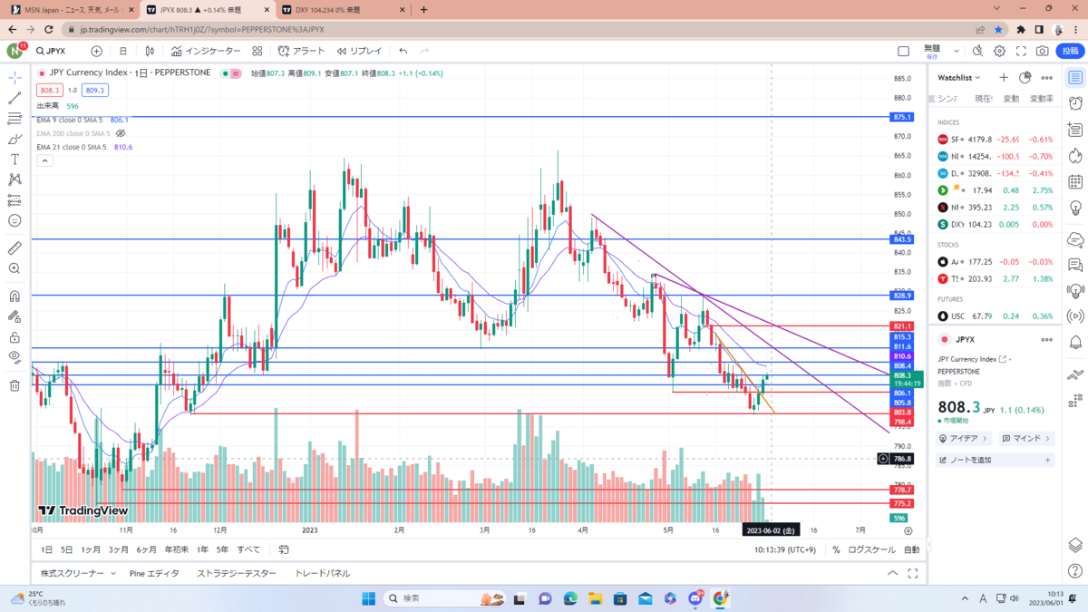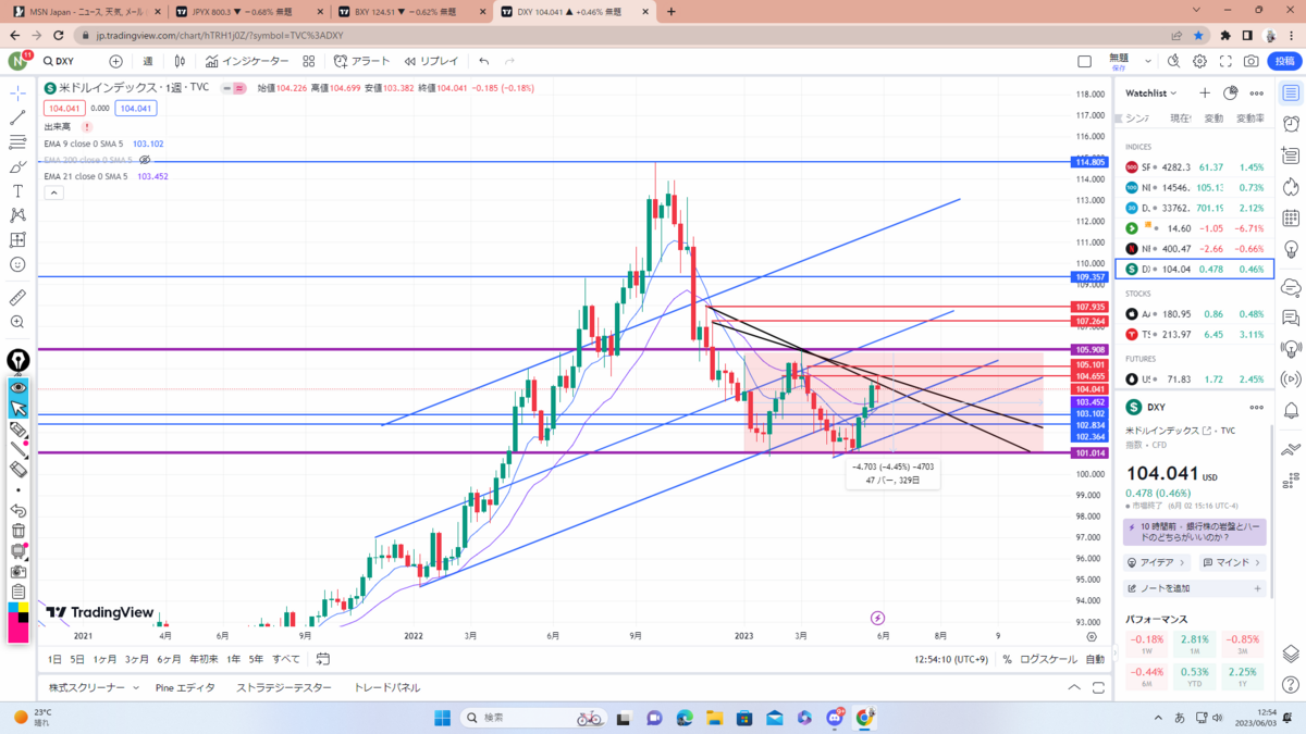 まずはドルインデックス考察。黒色のチャネルラインに3回目のタッチ中でここをブレイクするなら紫のレジサポまで。現状、政策金利の利上げ&利下げや債務上限問題、一旦静観している地銀問題もあるので反発の可能性も大いにあると思います。要チェック。