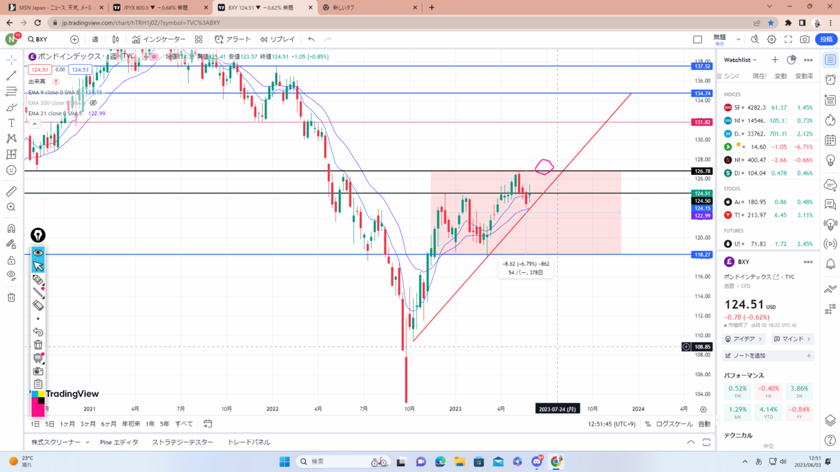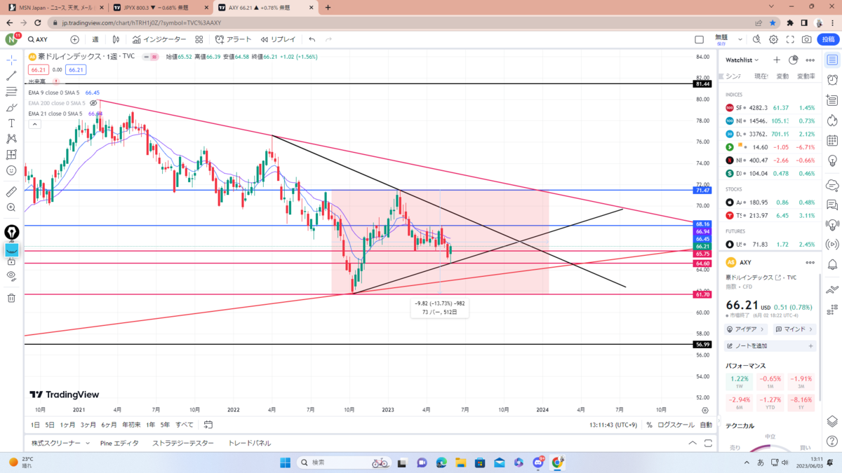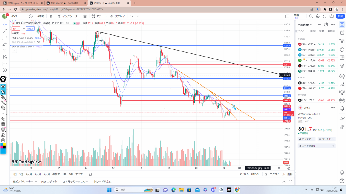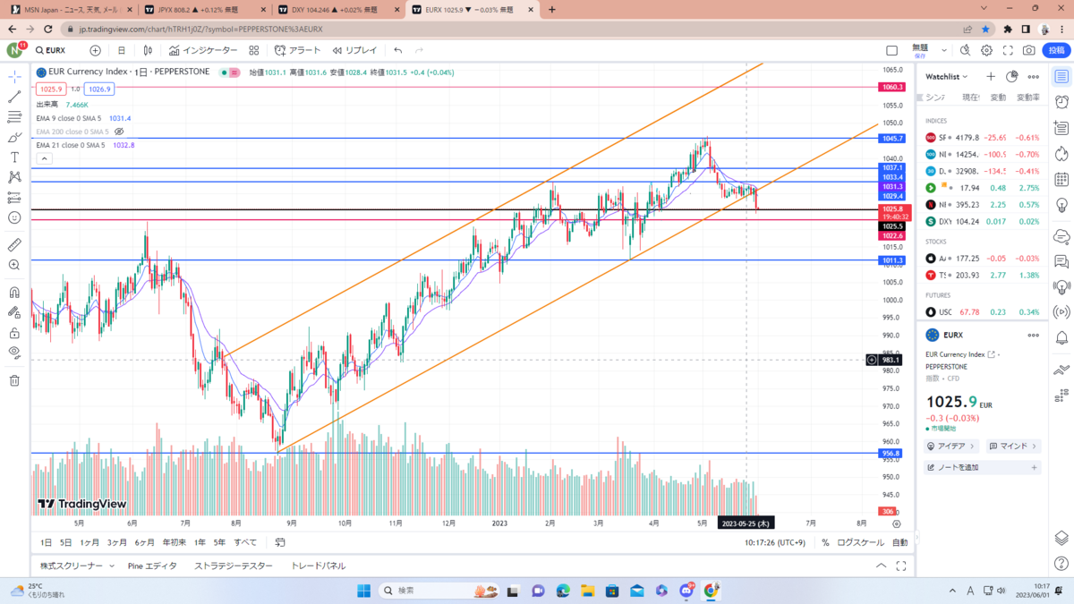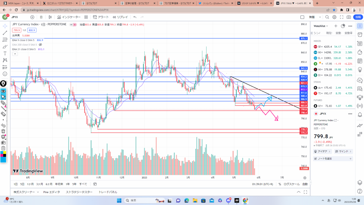 まずはドルインデックス考察。黒色のチャネルラインに3回目のタッチ中でここをブレイクするなら紫のレジサポまで。現状、政策金利の利上げ&利下げや債務上限問題、一旦静観している地銀問題もあるので反発の可能性も大いにあると思います。要チェック。