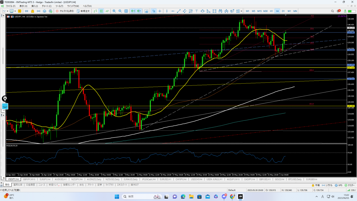 最後に来週のドル円考察です。こちらは4時間足。黄金比率の61.8%から指標で発射しましたね。指標発表後、様子見て139.00からロング入れて139.50でピヨピヨ利確。握力足りませんでしたw